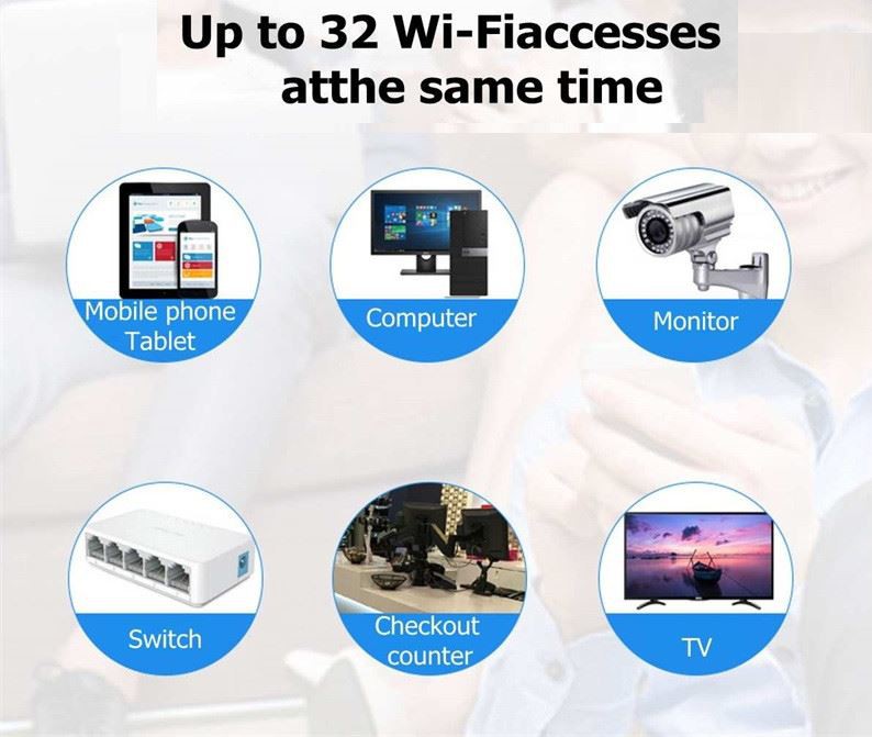 HASTA 32 accesos WiFi al mismo tiempo. Mientras el enrutador 4G transmite WiFi, también puede conectar computadoras, monitores, conmutadores, cajas registradoras, televisores y otros equipos con cables de red al mismo tiempo.